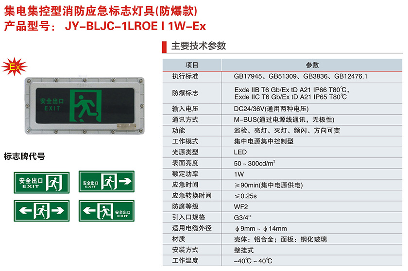 JY-BLJC-1LROE I 1W-Ex系列集电集控型消防应急标志灯具(防爆款)